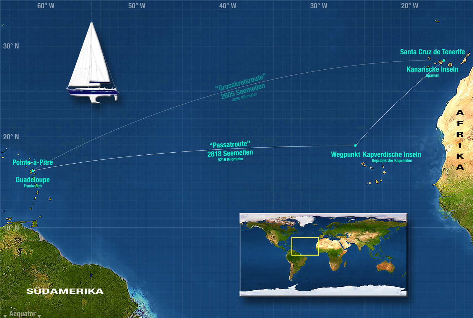 Die Passatroute, die wir für unseren Transatlantiktörn wählen, ist bereits seit geraumer Zeit bekannt. Christoph Kolumbus benützte sie bereits 1502 anlässlich seiner vierten Reise nach Amerika. Zwar landete er bereits 1493 anlässlich seiner zweiten Reise in Guadeloupe, doch damals kannte er offensichtlich die Vorzüge des Passatwindes noch nicht und segelte auf einer anderen, deutlich langsameren Route. Erst für seine letzte Reise nutzte er den Passatwind optimal und benötige für die Überfahrt von den Kanarischen Inseln in die Karibik 21 Tage, genau so lange, wie man heute für eine moderne Segelyacht auf dieser Route rechnet. Der Passat ist ein konstanter Ostwind nördlich (und südlich) des Äquators. Er kommt durch das Druckgefälle zwischen dem subtropischen Hoch und dem äquatorialen Tief zustande und bewegt sich demgemäss jahreszeitlich im Nord-Sommer nach Norden und im Nord-Winter nach Süden. Im Dezember erwarten wir den Passat südlich des zwanzigsten Breitengrades. Deswegen werden wir uns für die Reise von Teneriffa (28° N, 017° W) nach Guadeloupe (16° N, 061° W) nicht auf einem Grosskreis zwischen diesen beiden Punkten bewegen, welches die direkteste Verbindung wäre, sondern zuerst nach Südwesten zu einen Punkt nordwestlich der Kapverdischen Inseln (etwa 19° N, 026° W) segeln. Dort sollten wir zu dieser Jahreszeit auf den Passat treffen, der uns aller Voraussicht nach mit etwa vier Beaufort (11 – 16 Knoten) aus Ost bis Nordost in zügigem Tempo gen Westen bringen wird. Selbstverständlich werden wir unsere Route entsprechend den real vorgefunden Winden permanent leicht modifizieren. Ihr werdet die wirklich gesegelte Route hier im Internet (Link) verfolgen können. Die optimale Nutzung der Windverhältnisse ist heute genauso wichtig wie Anfang des 16. Jahrhunderts, da wir die Strecke von 2'800 Seemeilen (5'200 Kilometer) niemals mit dem Motor zurück legen können, reichen doch die rund 200 Liter Diesel in unserem Tank nur gerade für ca. 10 % der Strecke (250 bis 300 Seemeilen). Der Motor dient uns also nur dazu, hin und wieder etwas Strom zu produzieren (Batterien laden) und in Teneriffa und Guadeloupe die Hafenmanöver zu fahren. |